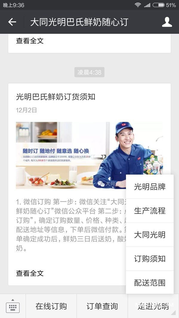 ★登錄大同光明巴氏鮮奶官方微信平臺付費;
