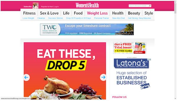 下圖是女性健康雜志的頁(yè)面,上面的Banner使用了粉紅色,導(dǎo)航設(shè)計(jì)更為大膽,除此以外網(wǎng)站其他的地方用色倒并不豐富。不得不說(shuō)這樣的選擇非常有趣。
