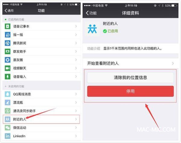 打開微信,依次點(diǎn)擊[我]—[設(shè)置]—[通用]—[功能],選擇[附近的人],點(diǎn)擊進(jìn)去后點(diǎn)擊關(guān)閉[清除我的位置信息]和[停用]。