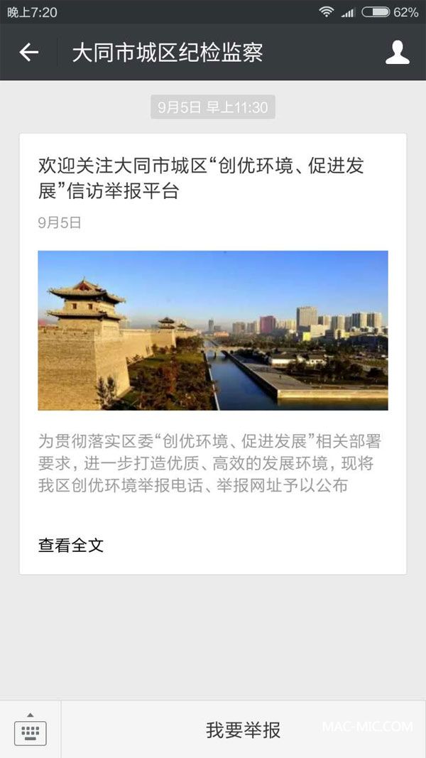 大同市城區(qū)紀檢監(jiān)察“創(chuàng)優(yōu)環(huán)境、促進發(fā)展”微信公眾服務平臺由大同微網(wǎng)站建設(shè)公司宏微信息技術(shù)設(shè)計制作,通過舉報平臺可以在線舉報、查詢城區(qū)在創(chuàng)優(yōu)環(huán)境方面存在的問題和建議,掃描以下二維碼可以關(guān)注。
