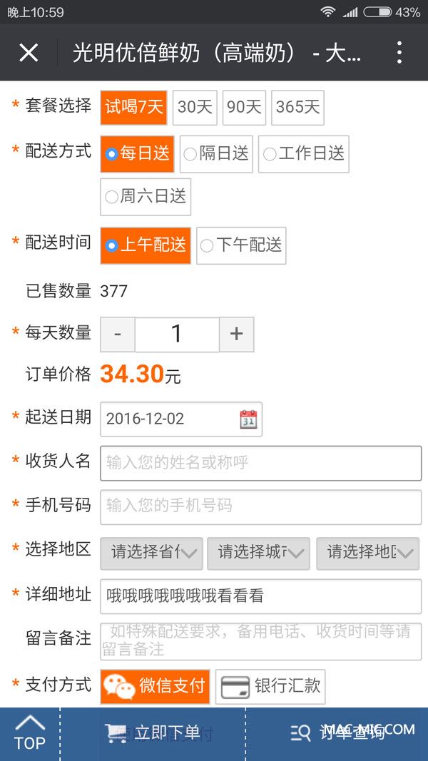 第二步:點擊“在線訂購”,確定訂購數(shù)量、價格、種類、起送時間、配送地址等信息,下單后微信付款。