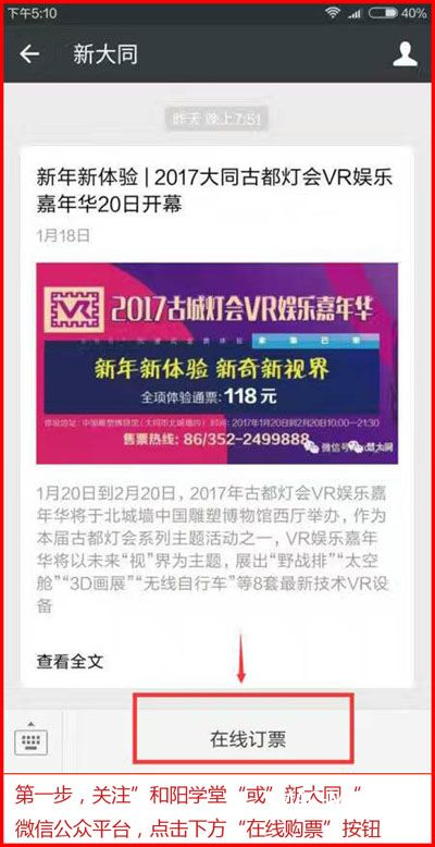 為了有更好的活動體驗,節(jié)省游客的排隊買票時間,古都燈火VR嘉年華特別在“大同市和陽學堂”和“新大同”微信平臺同時開設(shè)了網(wǎng)絡(luò)售票通道,無需排隊無需等待,關(guān)注“大同市和陽學堂”或“新大同”(微信號:sxdt_net)微信公眾平臺,在線購票后可以持電子門票掃碼直接入場。