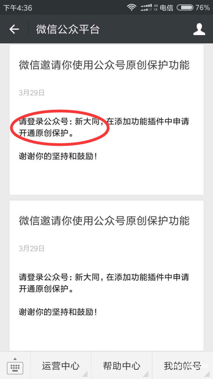 今天下午踏進(jìn)辦公室,剛坐到位置上不久,就聽小編一聲驚呼:“我們獲得微信原創(chuàng)了”,高興的我差點(diǎn)從樓梯上掉下去,果然,“新大同”微信公眾平臺(sxdt_net)成為官方邀請,獲得申請開通“原創(chuàng)聲明”功能。