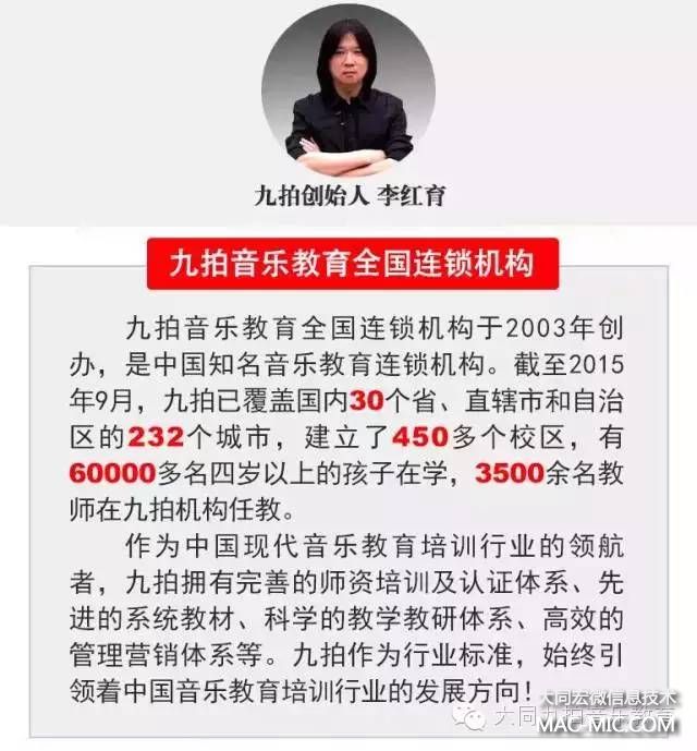 九拍教育科技集團(tuán)由李紅育老師于2003年創(chuàng)建,2015年九拍音樂教育全國連鎖強(qiáng)勢進(jìn)駐大同,總部設(shè)立在天津市南開學(xué)府創(chuàng)新園區(qū)。2006年,注冊(cè)成立了天津市九拍文化藝術(shù)發(fā)展有限公司,主要業(yè)務(wù)為音樂教育培訓(xùn)、樂器產(chǎn)品銷售及文化交流活動(dòng)。