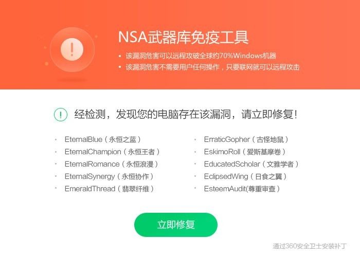 針對(duì)NSA黑客武器利用的Windows系統(tǒng)漏洞,微軟在今年3月已發(fā)布補(bǔ)丁修復(fù)。此前360安全中心也已推出“NSA武器庫(kù)免疫工具”,能夠一鍵檢測(cè)修復(fù)NSA黑客武器攻擊的漏洞;對(duì)XP、2003等已經(jīng)停止更新的系統(tǒng),免疫工具可以關(guān)閉漏洞利用的端口,防止電腦被NSA黑客武器植入勒索病毒等惡意程序。