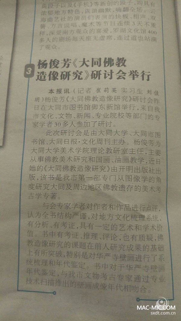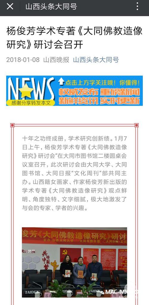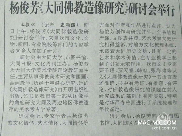 十年之功終成冊,學(xué)術(shù)研究創(chuàng)新績。2018年1月7日,伴隨著大同入冬以來的第一場瑞雪,楊俊芳的學(xué)術(shù)專著《大同佛教造像研究》作品研討會在大同市圖書館召開,本次活動由大同大學(xué)、大同市圖書館、大同日報·文化周刊共同主辦。來自大同大學(xué)、大同市文化界、學(xué)術(shù)界的眾多專家、學(xué)者、作家40余人共聚一堂,就該作品進行了研討。新大同網(wǎng)應(yīng)邀參加了本次會議。