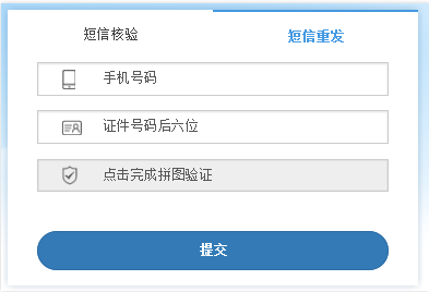 3.3、依次填寫驗證信息(驗證碼、手機號碼、證件號碼后六位)并完成圖形驗證,點擊【提交】按鈕。(證件號碼后六位指身份證號碼)